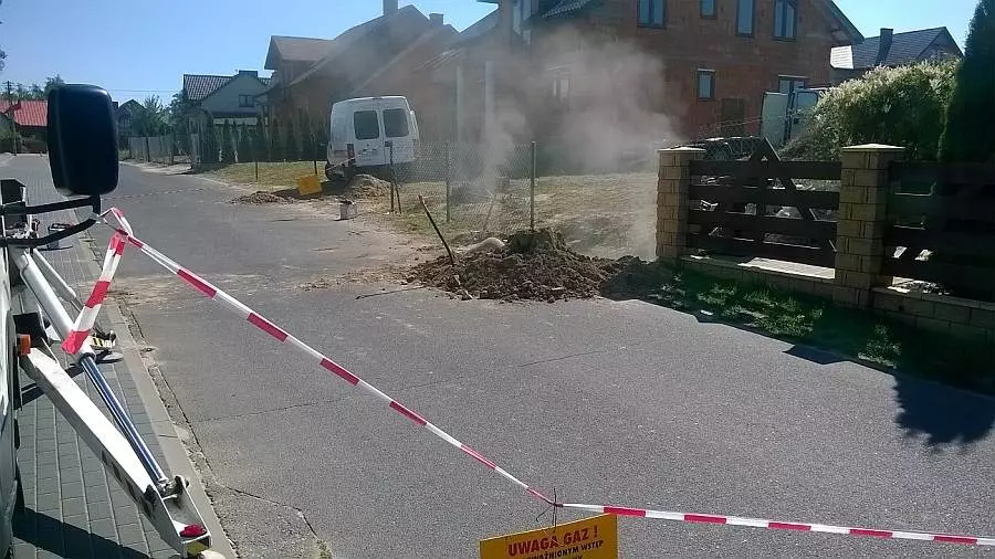 W miejscowości Brdów przy ul. Mickiewicza w dniu 31 sierpnia 2016r. podczas wykonywania przecisku sterowanego pod jezdnią doszło do uszkodzenia rury przesyłowej gazu ziemnego średniego ciśnienia.