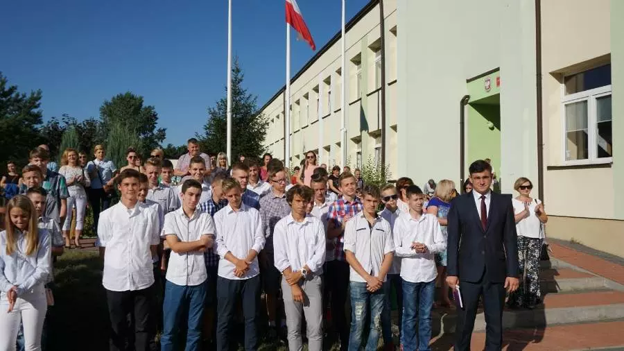 Zanim zabrzmiał pierwszy dzwonek na plac apelowy wprowadzono sztandary szkoły podstawowej i gimnazjum, społeczność szkolna odśpiewała uroczyście Mazurka Dąbrowskiego, a dyrektor szkoły powitał wszystkich po wakacyjnej przerwie.