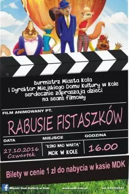 Burmistrz Miasta Koła i Dyrektor Miejskiego Domu Kultury w Kole serdecznie zapraszają dzieci na seans filmowy pt. „Rabusie fistaszków”, 27 października 2016 r., godz. 16.00. Bilety w cenie 1 zł do nabycia w kasie MDK.