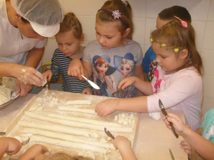 Dzieci poznały przyprawy używane w czasie gotowania, a następnie mogły z nich utworzyć jesienny krajobraz na brystolu. Przedszkolaki poznały sposób robienia ciasta na leniwe pierogi oraz każdy mógł je pokroić pod okiem pani kucharki. Wiele zabawy było przy zagniataniu ciasta i jego wałkowaniu, a potem wycinaniu w nim foremkami ciasteczek o różnorodnych kształtach.