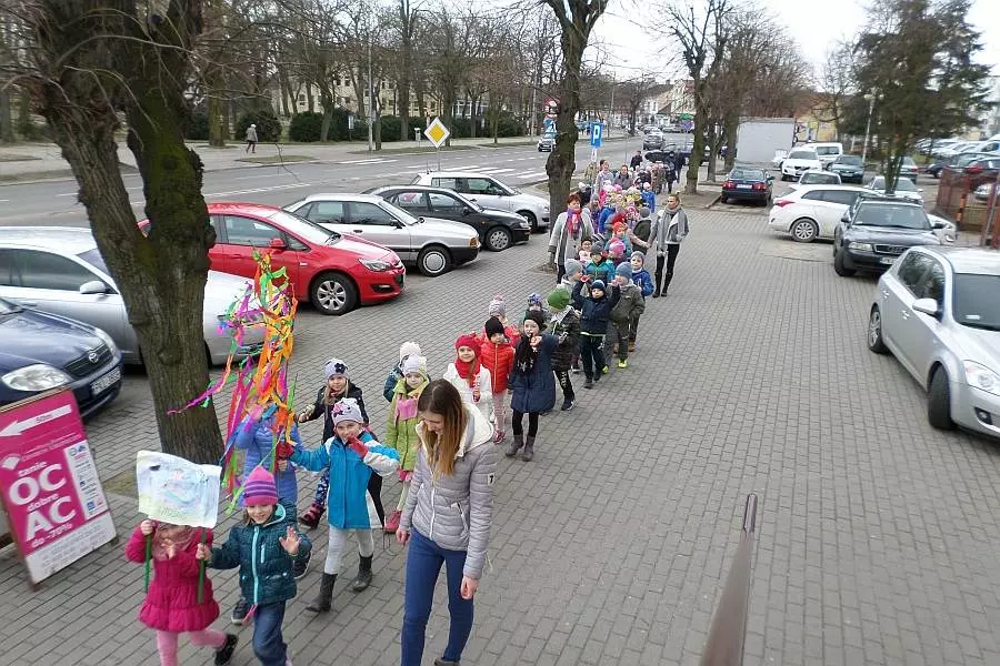 Przybyły do przedszkola w wiosennych strojach, aby zaakcentować nadchodzącą porę roku. Po zabawach w sali dzieci z czterech grup wraz z paniami wyruszyły barwnym pochodem na spacer ulicami miasta trzymając w rękach instrumenty oraz wiosenne emblematy. W ten sposób wszystkie dzieci chciały wyrazić swoją radość z przyjścia nowej pory roku.