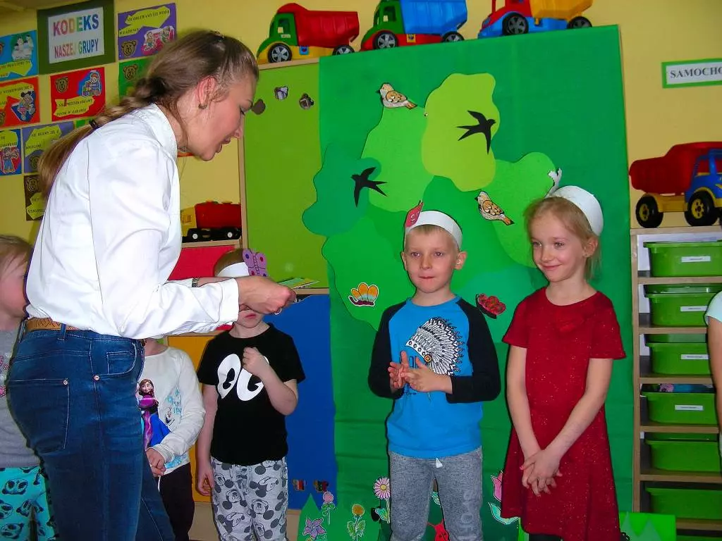 A o przyrodzie pamiętają nasze dzieci nie tylko w Dzień Ziemi. W każdej grupie wiekowej prowadzi się zajęcia z zakresu przyrody i ekologii. Przy każdej okazji poszerza się wiadomości dzieci o środowisku przyrodniczym, prowadzi się obserwacje przyrodnicze, zakłada się zielone ogródki w kącikach przyrody. Dzieci wiedzą, że należy oszczędzać wodę podczas mycia zębów, wykorzystywać obie strony kartek papieru, zimą dokarmiać ptaki, a w ogrodzie i parku nie zrywać kwiatów i nie łamać gałęzi. Święto Ziemi to święto radości, zabawy. Dlatego gospodarze zaprosili kolegów do wspólnej zabawy w segregowanie śmieci, śpiewanie, powtarzanie haseł ekologicznych, do udziału w konkursach. 5- latki zaprezentowały też przygotowaną część artystyczną na którą składała się inscenizacja wiersza, piosenka i układ taneczny. Przedstawiciele wszystkich grup zaprezentowali również krótkie formy teatralne i inscenizacje o tematyce przyrodniczej. Podsumowaniem uroczystości było złożone przez dzieci ślubowanie ekologiczne oraz sadzenie kolejnego już drzewka w ogrodzie przedszkolnym.