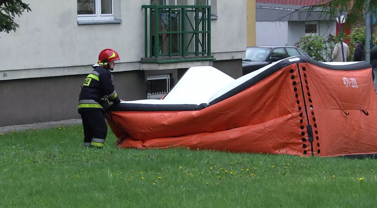 Strażacy pod balkonem rozłożyli dmuchany materac, aby zabezpieczyć kobietę w przypadku skoku z balkonu.