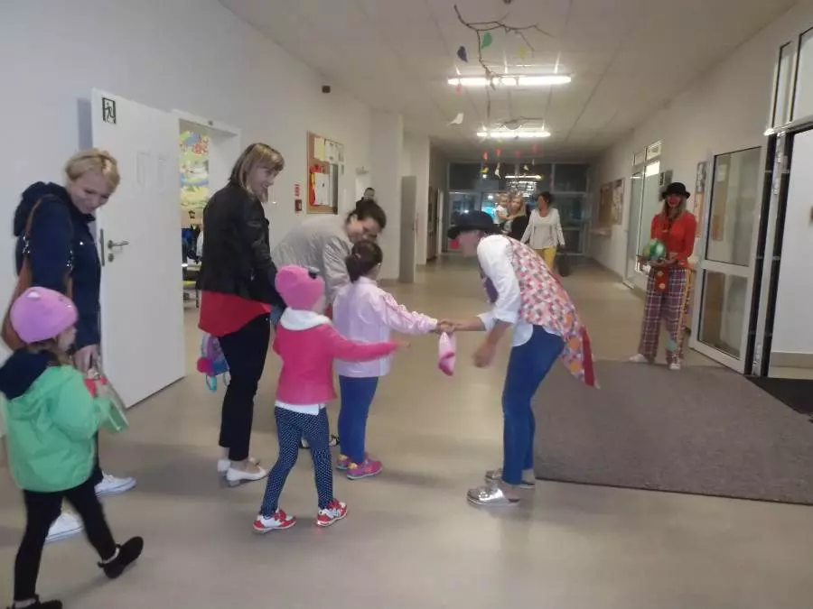 Przedszkolaki zachwycone były wizytą klaunów. Z uśmiechem na twarzy wędrowały przebrać się do szatni by za chwilę znowu spotkać się z klaunami w drodze do swoich sal.