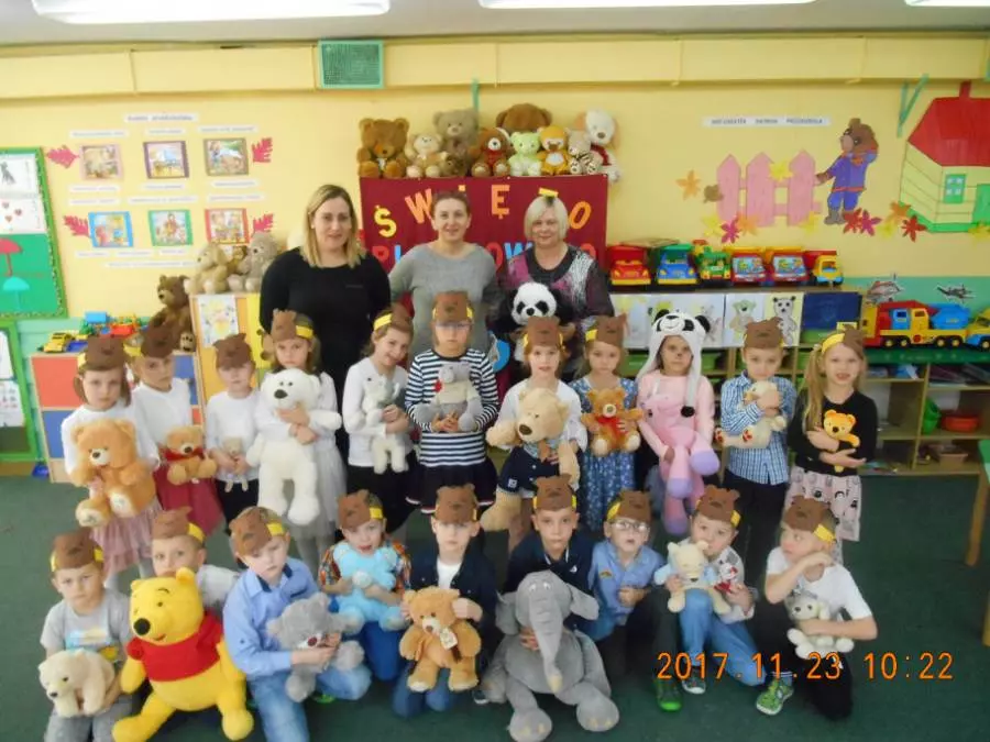 Dzień Pluszowego Misia obchodzony jest w tym roku 25 listopada dlatego też dzieci z grupy IV wraz z nauczycielką p. E. Szacowną zaprosiły wszystkich przedszkolaków do wspólnych zabaw z misiakami w przeddzień tego święta. Na uroczystość Święta Pluszowego Misia, która odbyła się 23 listopada 2017r w PM nr 5, gospodarze 5 i 6 latki zaprosiły panią Annę Pietruszkę z Powiatowej i Miejskiej Biblioteki Publicznej w Kole, Dyrektor PM nr 5 panią Agnieszkę Kozajdę, nauczycielki poszczególnych grup i całą społeczność przedszkolną. Wszyscy na te wesołe zabawy integracyjne przynieśli swoje ulubione pluszaki. Wspólne powitanie przypomniało patrona Przedszkola Miejskiego nr 5 w Kole i radość jaką sprawia fakt być razem w Gromadce Misia Uszatka. Pogodny nastrój wywołała także zaśpiewana piosenka „Witajcie w naszej bajce” z Akademii pana Kleksa. Następnie gospodarze przedstawili część artystyczną dla kolegów z innych grup i zaproszonych gości, w której zaprezentowali wierszyki o misiu. Wierszyki wyjaśniały wszystkim przedszkolakom po co właściwie są te misie. Dzieci zatańczyły układ taneczny do piosenki „Pluszowy miś” i pokazały inscenizację ruchową „Jadą, jadą misie”. Wiele radości sprawiła wszystkim przedszkolakom wspólna zabawa, rozwiązywanie zagadek obrazkowych, muzycznych, udział w konkursie „Misie” i pogadanka bibliotekarza. Pani Anna Pietruszka bibliotekarka z PiMBP w Kole opowiedziała dzieciom historię powstania misia. Wyjaśniła nazwę Teddy Bear, która wzięła się od zdrobnienia imienia Teodora Roosevelta. Wiąże się z tym historia o niedźwiadku, którego postrzelił podczas polowania jeden z jego towarzyszy. Pokazała dzieciom książki, których głównymi postaciami są misie. Często są one bohaterami powieści, bajek, filmów i piosenek tak jak m.in. Miś Uszatek, Kubuś Puchatek, Coralgol, Paddington, Yogi, Rupert, Mój Brat Niedźwiedź, Mały Miś, Troskliwe Misie czy Gumisie. Dzieci z uwagą wysłuchały tekstu książeczki „ Bach! Mówi miś Olo” autorstwa Tony Kenyon,świetnie się bawiły rozpoznając i nazywając tytuły książek spotykanych w bibliotece. Miłe, radosne i pożyteczne spędzanie czasu przez wspólną zabawę, udział w konkursach, wysłuchanie pogadanki bibliotekarza zakończyło nagrodzenie dzieci konkursu plastycznego „Mój miś”, wręczenie dyplomów uznania i misiowych niespodzianek do powielenia, podziękowanie wszystkim przedszkolakom i przybyłym gościom. Dzieci uroczyście przyrzekły, iż będą dbać o swoje misie. Jednak jeśli się im przytrafi jakaś kłopotliwa przygoda, a niekiedy z misiami tak bywa, to postąpią tak jak w wygłoszonym przez gospodarzy wierszyku „Naprawimy misia”.
