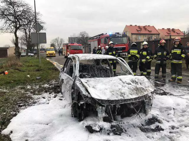 Samochód uległ doszczętnemu spaleniu mimo szybkiego dojazdu na miejsce zdarzenia jednostek straży pożarnej oraz podaniu specjalistycznej piany do gaszenia tego typu pożarów.