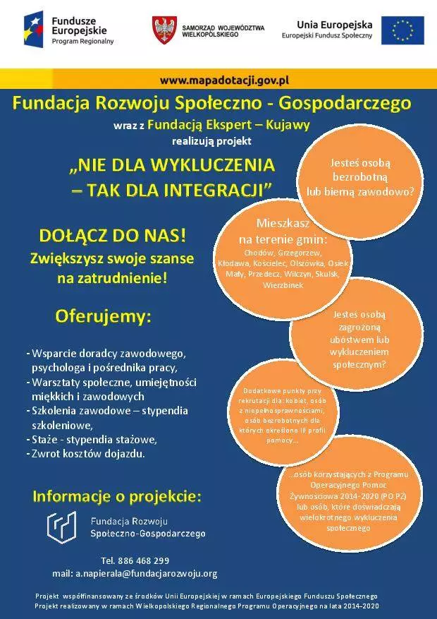 Fundacja Rozwoju Społeczno-Gospodarczego zaprasza do udziału w projekcie: NIE DLA WYKLUCZENIA - TAK DLA INTEGRACJI. Projekt jest współfinansowany ze środków UE - Europejskiego Funduszu Społecznego w ramach Wielkopolskiego Regionalnego Programu Operacyjnego Osi priorytetowej 7.
