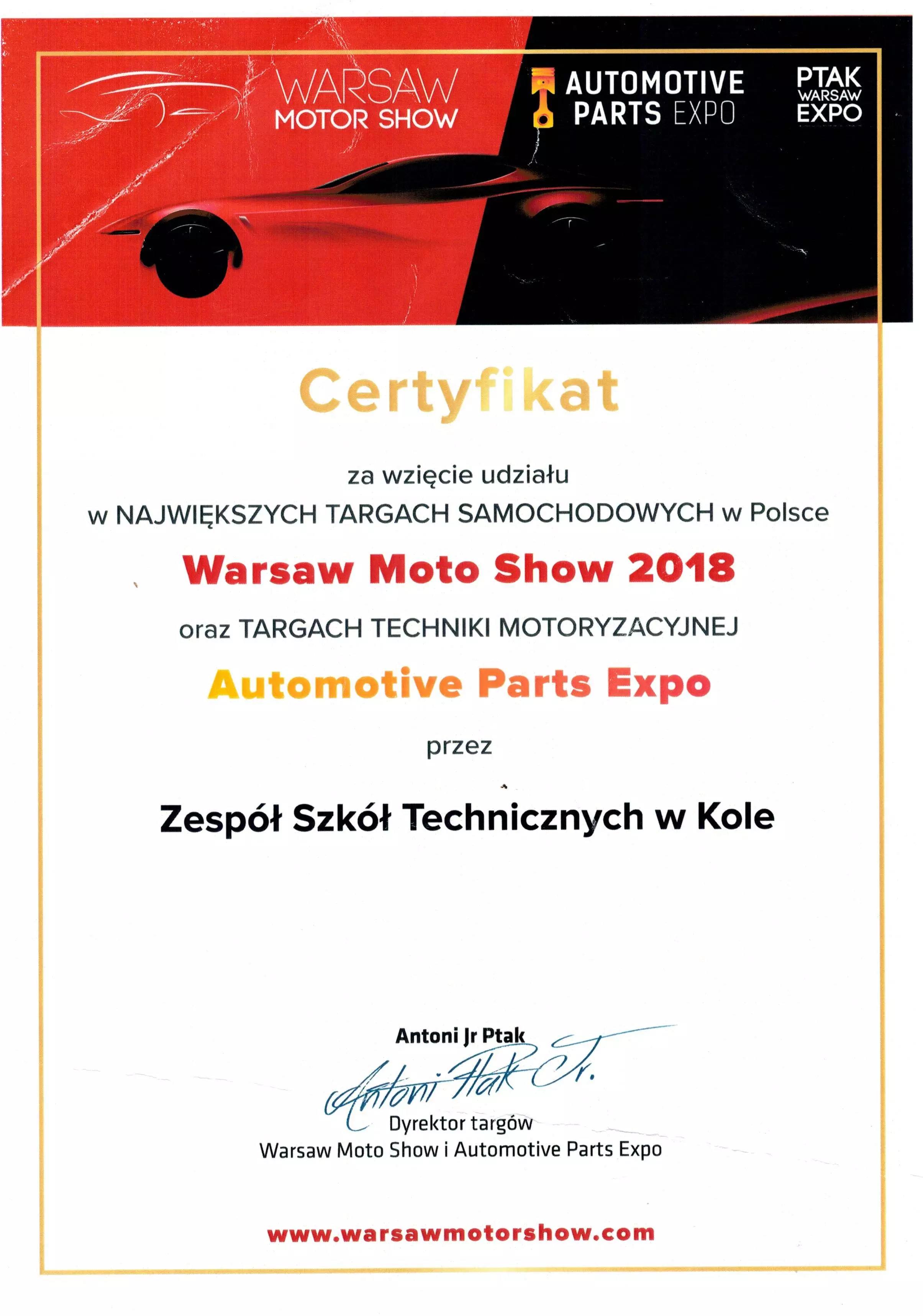 Zespół Szkół Technicznych uzyskał Certyfikat za uczestnictwo w Największych Targach Samochodowych w Europie Środkowej – Warsaw Moto Show 2018 oraz Targach Techniki Motoryzacyjnej Automotive Parts Expo.