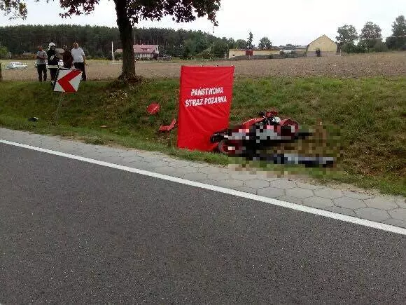 Motocyklem marki Kawasaki podróżowało dwóch mężczyzn z Koła, 37 i 35-latek. Z nieznanych przyczyn, na łuku drogi nr 473 na wysokości miejscowości Skobielice motocykl wypadł z drogi uderzając w znak pionowy i wpadł do rowu. W wyniku zdarzenia śmierć na miejscu poniósł 35-latek. O życie drugiej osoby walczą ratownicy. Na miejsce wezwano helikpter LPR, który przetransportował rannego do szpitala w Koninie.