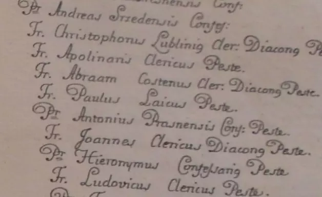 Na zdjęciu fragment Nekrologu kolskiego klasztoru OO. Bernardynów z wymienionymi zmarłymi w 1625 r. zakonnikami. Obok każdego mamy adnotację o zarazie, jako przyczynie śmierci (peste - z łac. zaraza).