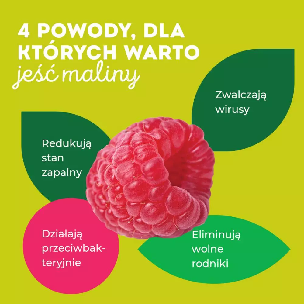 Warto też wspomnieć o potencjale malin w zakresie przeciwdziałania dość częstym w naszej populacji zakażeniom układu pokarmowego wywołanym przez bakterie helicobacter pylori (takie zakażenie może powodować tzw. objawy dyspeptyczne, jak np. uczucie ciężkości po posiłku czy zgaga, ale także prowadzić do zapalenia błony śluzowej żołądka, choroby wrzodowej żołądka lub dwunastnicy, rzadziej do raka żołądka czy niedokrwistości z niedoboru żelaza).
