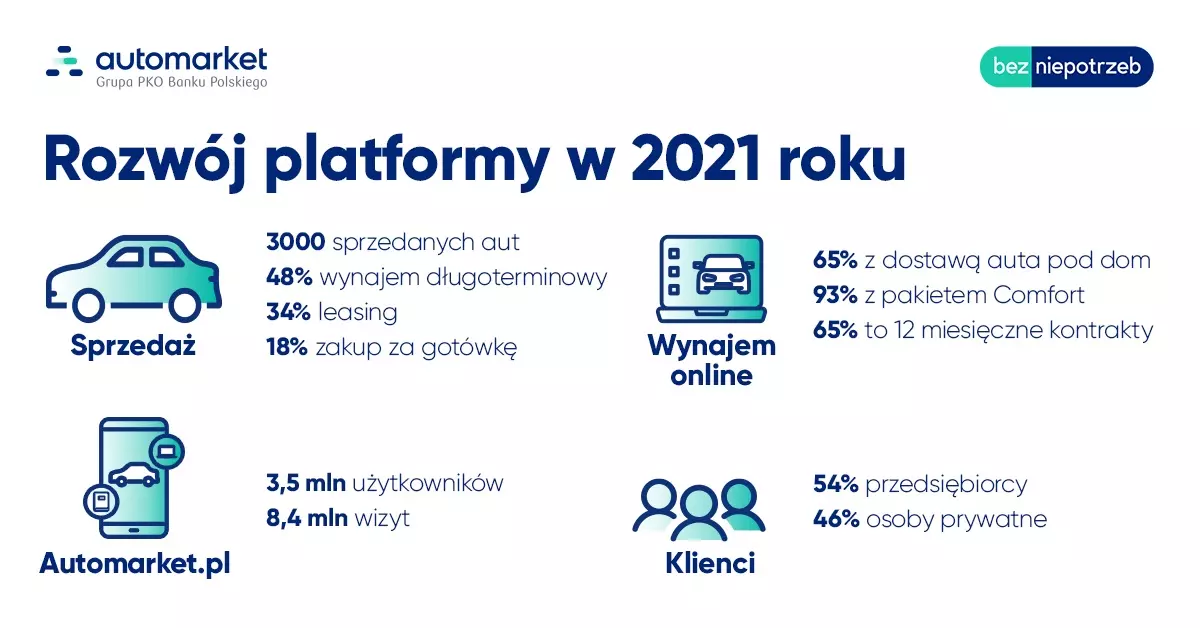 Platforma Automarket.pl, należąca do Grupy Kapitałowej PKO Banku Polskiego, zrealizowała plany na ubiegły rok i sprzedała ponad trzy tysiące samochodów, mimo pandemii i ograniczonej podaży. W 2022 r. nie zamierza zwalniać tempa i prognozuje, że klienci zakupią w tym roku cztery tysiące oferowanych przez nią aut.