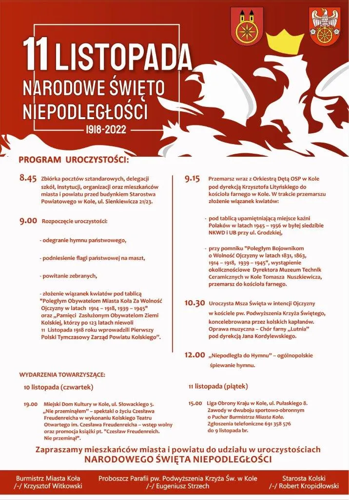 Burmistrz Miasta Koła Krzysztof Witkowski, Proboszcz Parafii p.w. Podwyższenia Krzyża Św. w Kole Eugeniusz Strzech, Starosta Kolski Robert Kropidłowski zapraszają mieszkańców miasta i powiatu do udziału w uroczystościach Narodowego Święta Niepodległości.