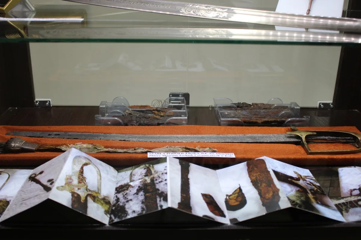 W gablotach podziwiać można militaria nawiązujące do tematyki obrazów.