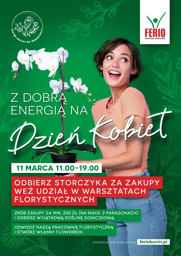 Ferio Konin przedłuża świętowanie Dnia Kobiet i zaprasza mieszkańców Konina i okolic 11 marca do wzięcia udziału w wyjątkowych aktywnościach. Co znajduje się w programie? Otwarte i darmowe warsztaty florystyczne, wernisaż prac młodych plastyków oraz możliwość otrzymania pięknego storczyka. Wszystkie te wydarzenia wpisują się w miejski projekt: Konin Miasto Kobiet