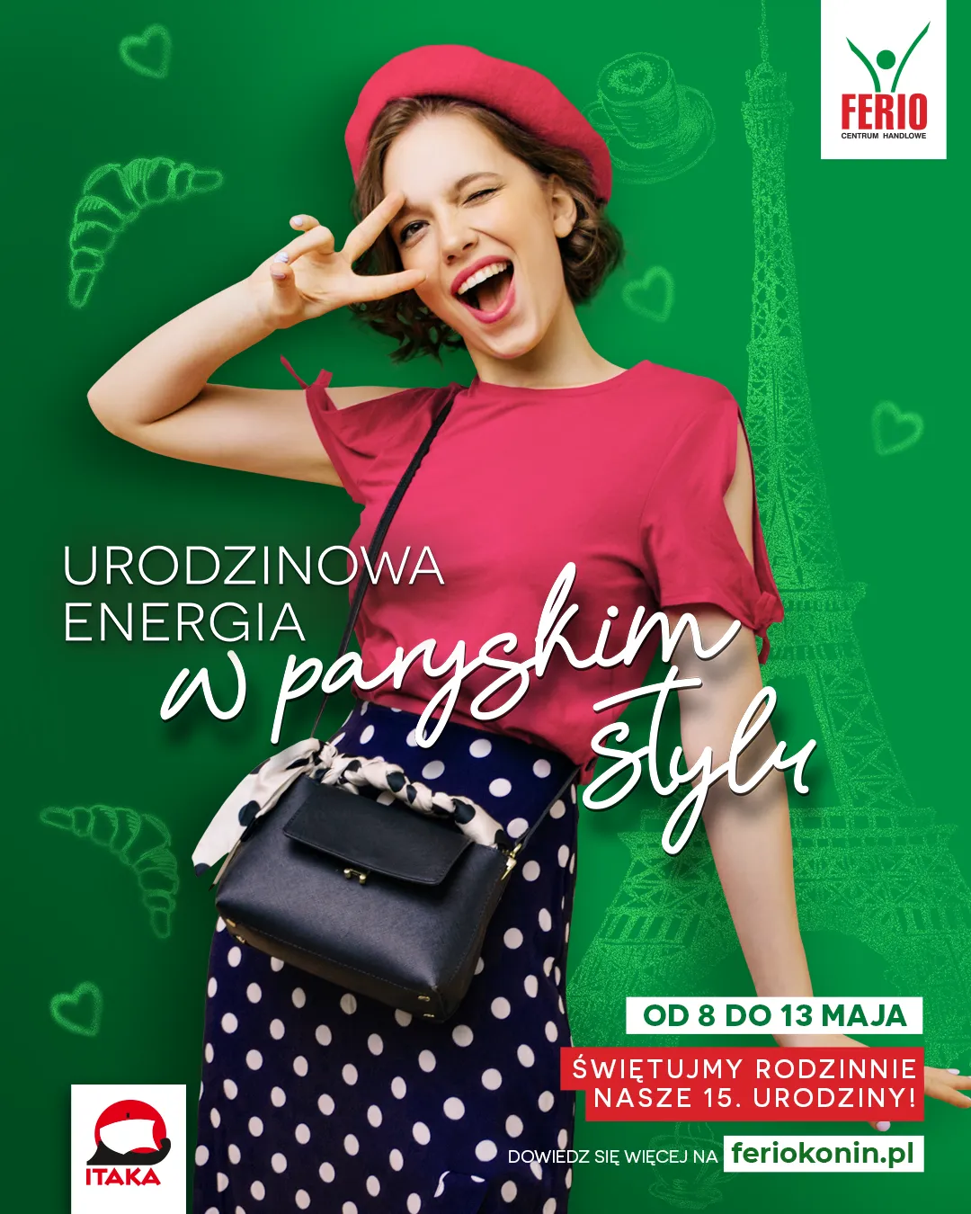 W ramach obchodów okrągłych urodzin, Ferio Konin przygotowało moc urodzinowych atrakcji. Od 8 do 13 maja centrum zaprasza wszystkich chcących dołączyć do jubileuszowej zabawy. Na klientów Ferio czekają wyjątkowe nagrody, w tym vouchery na wycieczkę do Paryża z ITAKĄ.