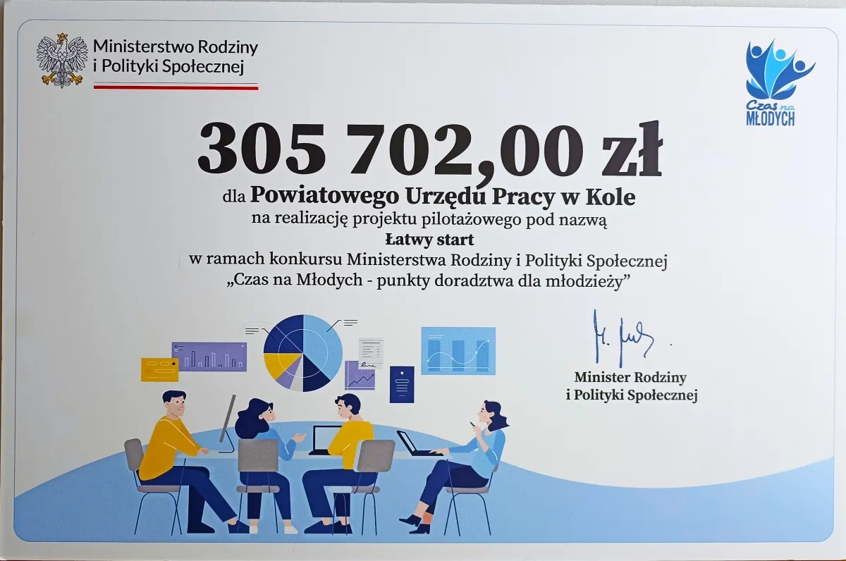 Powiatowy Urząd Pracy w Kole otrzymał dofinansowanie na realizację projektu pilotażowego pt. "Łatwy Start", w ramach ogłoszonego przez Ministerstwo Rodziny i Polityki Społecznej naboru na projekty pilotażowe pod nazwą "Czas na Młodych – punkty doradztwa dla młodzieży".