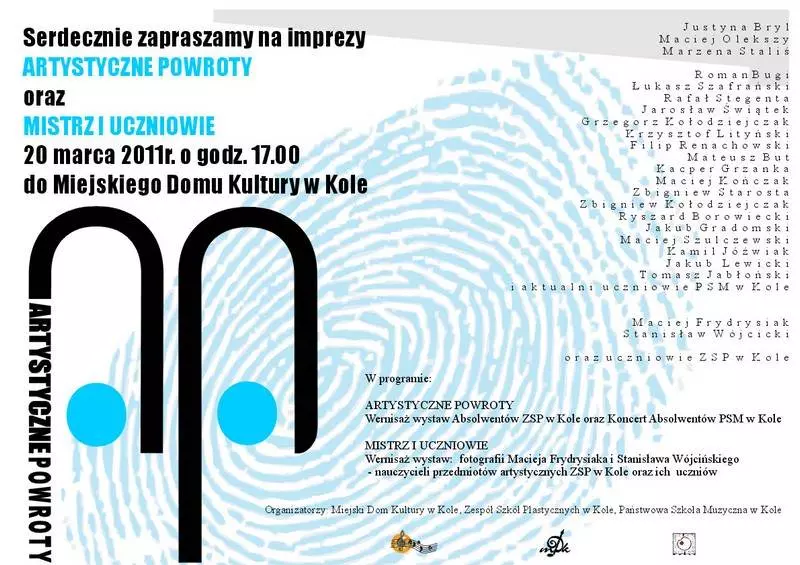 “ARTYSTYCZNE POWROTY” - to cykl prezentujący dorobek twórczy absolwentów kolskich szkół artystycznych. Na każde spotkanie składa się koncert w wykonaniu absolwentów PSM oraz wernisaż wystawy prac absolwentów ZSP w Kole. Trzecia impreza cyklu promować będzie twórczość Justyny Bryl, Macieja Olekszego oraz Marzeny Staliś – byłych uczniów kolskiego “plastyka”; wysłuchamy również koncertu dwóch zespołów – instrumentów dętych i big bandu – w skład których wejdą absolwenci, pedagodzy i obecni uczniowie szkoły muzycznej: Roman Buga, Łukasz Szafrański, Rafał Stegenta, Jarosław Świątek, Grzegorz Kołodziejczak, Krzysztof Lityński, Filip Renachowski Mateusz But, Kacper Grzanka, Maciej Kończak, Zbigniew Starosta, Zbigniew Kołodziejczak, Ryszard Borowiecki, Jakub Gradomski, Maciej Szulczewski, Kamil Jóźwiak, Jakub Lewicki, Tomasz Jabłoński, Zbigniew Żmijewski, Izabela Rybnik, Jakub Zastawny, Jakub Jóźwiak, Daniel Milewski, Łukasz Brzozowski, Mateusz Garstecki.