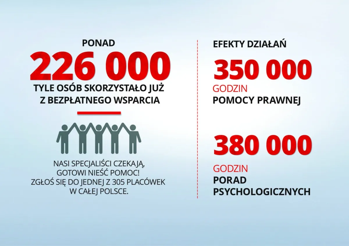 W Polsce działa 305 ośrodków finansowanych ze środków Funduszu Sprawiedliwości, którego dysponentem jest Minister Sprawiedliwości Zbigniew Ziobro. Można tam uzyskać bezpłatną pomoc prawną, psychologiczną, a w razie potrzeby również materialną. Od wejścia w życie ustawy antyprzemocowej z pomocy placówek skorzystało ponad 26,5 tys. osób dotkniętych przemocą domową. Specjaliści zatrudnieni w ośrodkach pomagają każdej osobie pokrzywdzonej przestępstwem, niezależnie od rodzaju przestępstwa.
