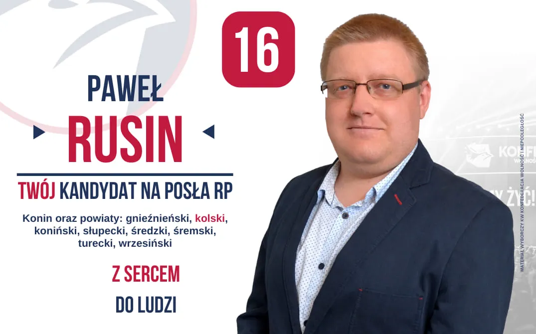 Paweł Rusin z Koła (lat 32) wystartuje listy Konfederacji z miejsca nr 16. "Z sercem do ludzi" to jego hasło wyborcze, które możemy zauważyć na pierwszych materiałach wyborczych. Wśród informacji opublikowanych na profilu facebookowym kandydata możemy przeczytać, że studiował na Uniwersytecie Adama Mickiewicza w Poznaniu.