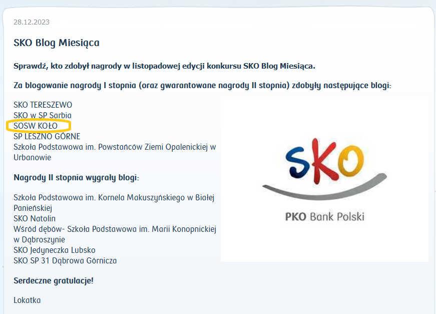 Specjalny Ośrodek Szkolno-Wychowawczy im. Świętego Mikołaja w Kole, który bardzo aktywnie działa w SKO, po raz siódmy został nagrodzony tytułem SKO Blog Miesiąca.
