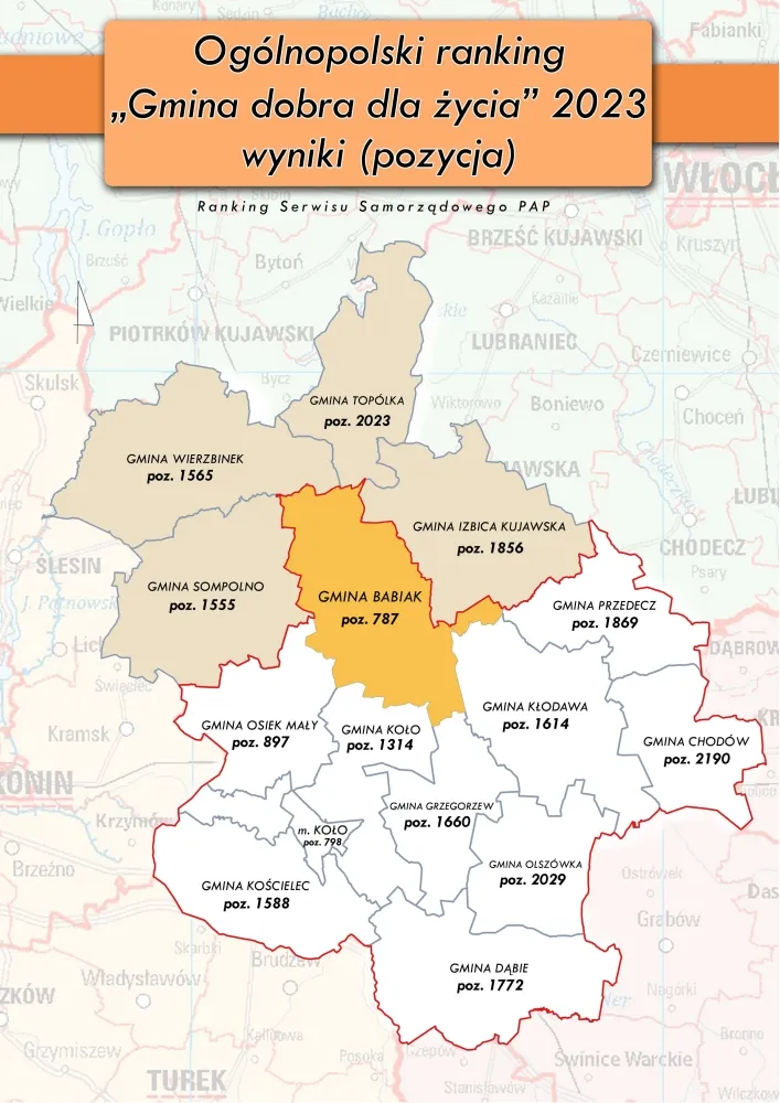 Na 2477 gmin w Polsce, Gmina Babiak zajęła w głównym rankingu pozycję 787, wyprzedzając wszystkie gminy z Powiatu Kolskiego, a także wszystkie gminy sąsiadujące z nami z innych powiatów. W kategorii gmin wiejskich na 1610 samorządów, babiacki uplasował się na 264 pozycji. Coroczny wzrost notowań dla Gminy Babiak w powyższym rankingu to efekt systematycznego i zrównoważonego rozwoju samorządu, opartego na konsekwentnej realizacji strategii i wsłuchiwania się w potrzeby Mieszkańców.