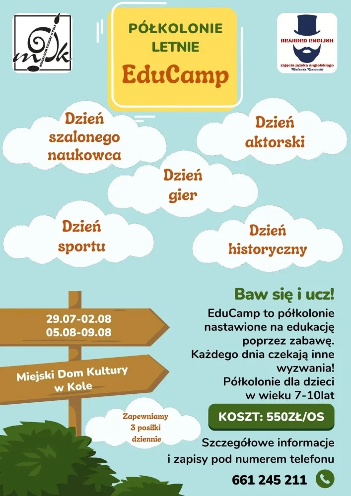 Miejski Dom Kultury w Kole zaprasza na letnie półkolonie EduCamp. To wyjątkowa okazja dla dzieci w wieku 7-10 lat, aby bawić się i uczyć jednocześnie. Każdy dzień przyniesie nowe wyzwania i atrakcje.