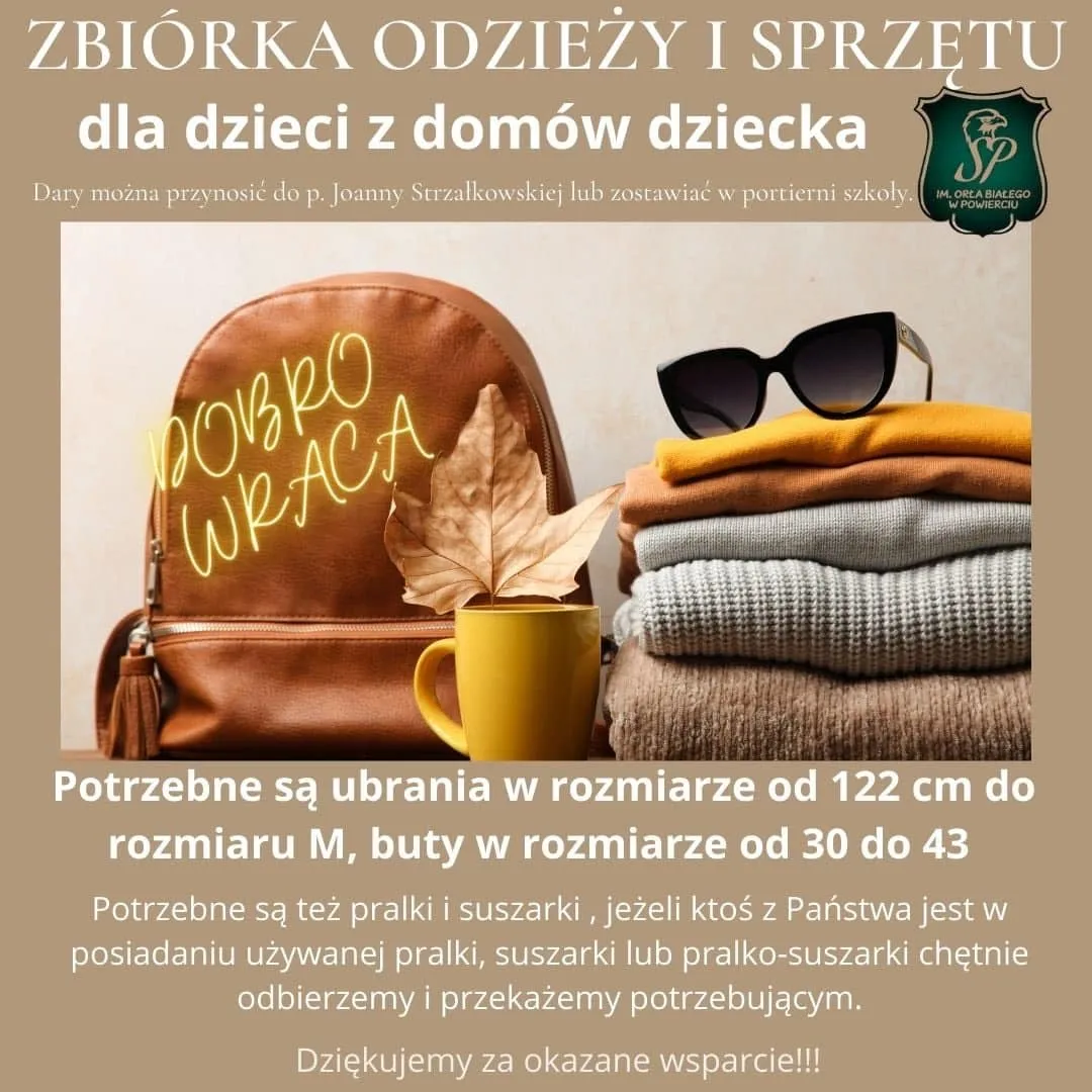 Szkoła Podstawowa im. Orła Białego w Powierciu organizuje zbiórkę odzieży i sprzętu dla dzieci z domów dziecka. W ramach akcji można przekazywać ubrania, obuwie oraz sprzęt AGD, który pomoże w codziennym funkcjonowaniu placówek opiekuńczych. Zbiórka skierowana jest do osób, które chcą wesprzeć dzieci w potrzebie, poprzez ofiarowanie nieużywanej odzieży oraz sprzętu domowego.