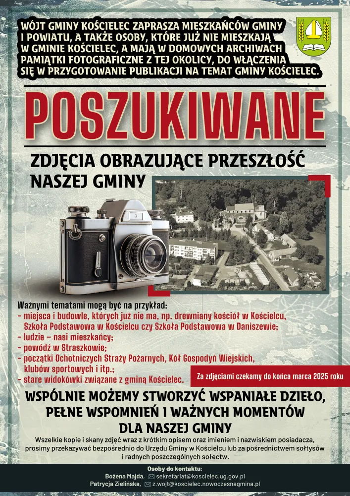 ‼Wójt Gminy Kościelec‼ zaprasza mieszkańców gminy i powiatu, a także osoby, które już nie mieszkają w gminie Kościelec, a mają w domowych archiwach pamiątki fotograficzne z tej okolicy, do włączenia się w przygotowanie publikacji na temat gminy Kościelec.
