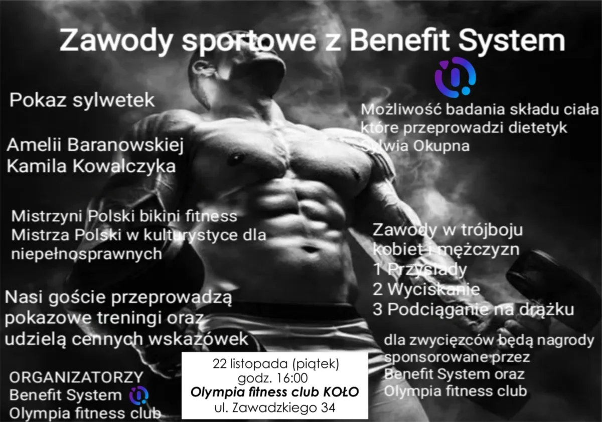 22 listopada 2024 roku w Olympia fitness club w Kole odbędą się pierwsze takie zawody sportowe z Benefit System. Wydarzenie zaplanowano na godzinę 16:00, a uczestnicy oraz widzowie mogą liczyć na mnóstwo atrakcji, w tym pokazy sylwetek, zawody w trójboju oraz możliwość skorzystania z profesjonalnej analizy składu ciała.