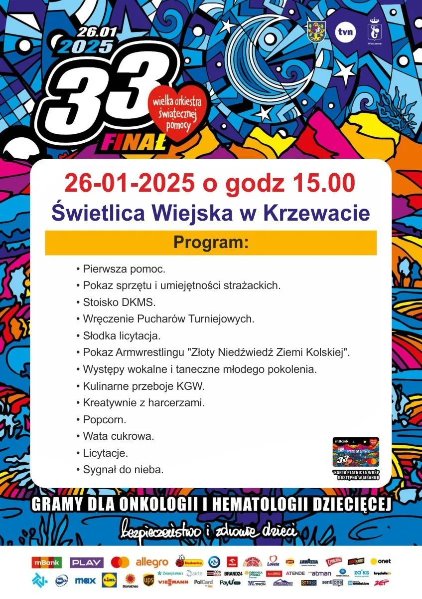 26 stycznia 2025 roku, o godzinie 15:00, Świetlica Wiejska w Krzewacie stanie się miejscem niezwykłego wydarzenia związanego z 33. Finałem Wielkiej Orkiestry Świątecznej Pomocy. Mieszkańcy Gminy Olszówka oraz okoliczni goście będą mogli uczestniczyć w wielu interesujących atrakcjach i aktywnościach, które nie tylko zapewnią świetną zabawę, ale również przyczynią się do szczytnego celu.