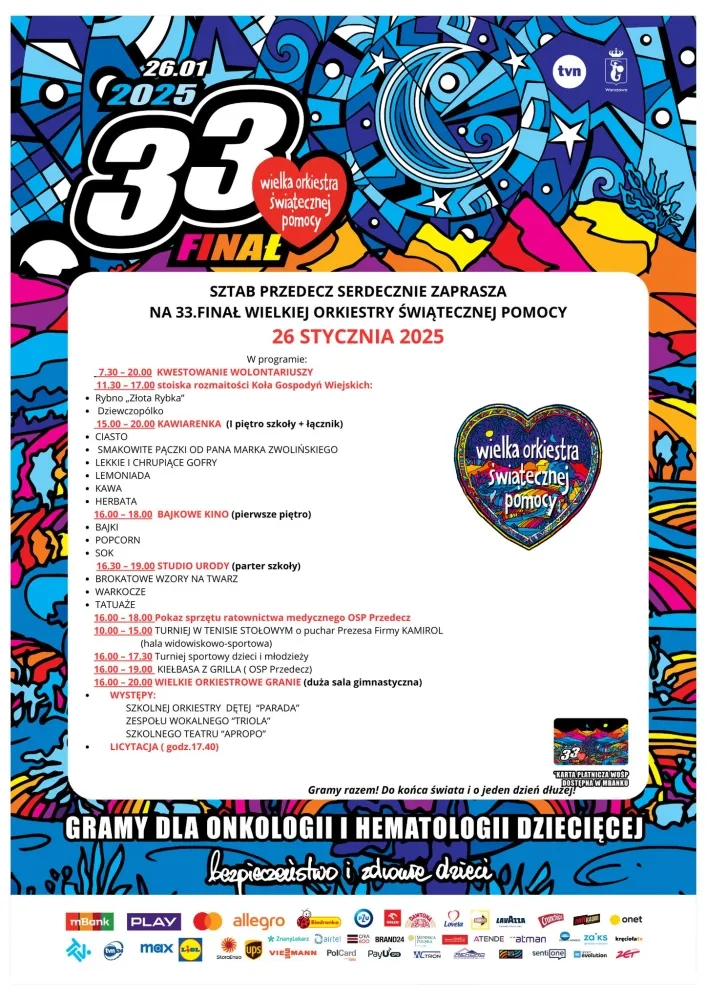 26 stycznia 2025 roku w Przedczu odbędzie się 33. Finał WOŚP, który zainauguruje kwestowanie prowadzone przez wolontariuszy. Akcja rozpocznie się o godzinie 7:30 i potrwa do 20:00, oferując społeczności lokalnej możliwość aktywnego udziału w zbiórce funduszy.