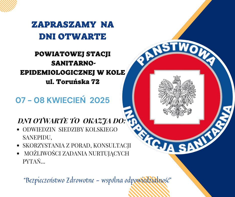 Państwowy Powiatowy Inspektor Sanitarny w Kole zaprasza mieszkańców powiatu kolskiego na wyjątkowe wydarzenie. W dniach 7-8 kwietnia 2025 roku w siedzibie sanepidu przy ul. Toruńskiej 72 odbędą się Drzwi Otwarte, które pozwolą na lepsze poznanie działalności inspekcji sanitarnej oraz jej roli w zapewnieniu zdrowia i bezpieczeństwa społeczeństwa.