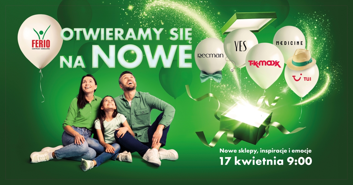 Już w najbliższy czwartek mieszkańcy Konina i okolic zyskają nową, jeszcze większą przestrzeń zakupowo-usługową! Ferio otwiera rozbudowaną część centrum, a wraz z nią wkraczają znane marki: TK Maxx, Medicine, Recman, salon biżuterii YES i biuro podróży TUI. Z tej okazji szykuje się dzień pełen atrakcji – nie może Cię zabraknąć!