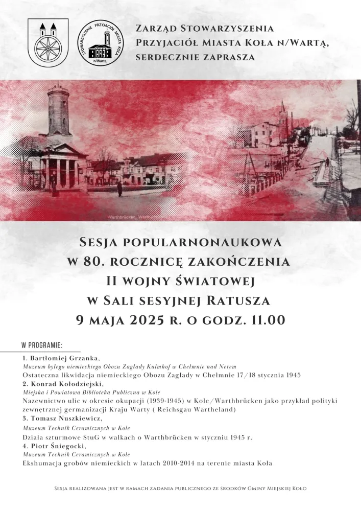 9 maja 2025 r. o godzinie 11.00 odbędzie się sesja popularnonaukowa zorganizowana w sali sesyjnej Ratusza w Kole. Wydarzenie to ma na celu upamiętnienie 80. rocznicy zakończenia II wojny światowej oraz przybliżenie istotnych aspektów tego okresu.