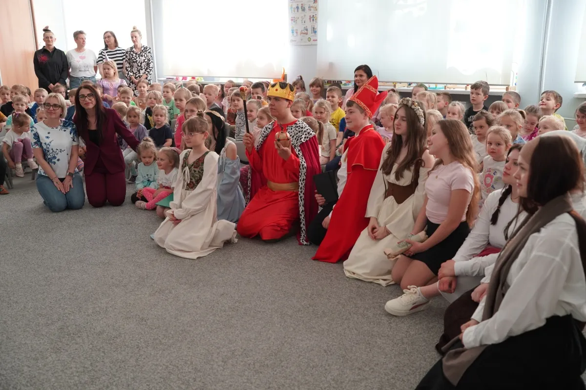 Do szkoły przybył królewski orszak. Uczniowie z klas mieli okazję uczestniczyć w interaktywnych lekcjach historii, które były wzbogacone o elementy teatralne. Król Bolesław Chrobry, w asyście swojego otoczenia, odwiedzał kolejne sale, dzieląc się wiedzą na temat średniowiecznej Polski. Ciekawym akcentem tego spotkania było to, że królewska korona na chwilę wylądowała na niejednej dziecięcej główce, a królewskie insygnia wzbudzały duże zainteresowanie wśród uczniów, przechodząc z rąk do rąk.