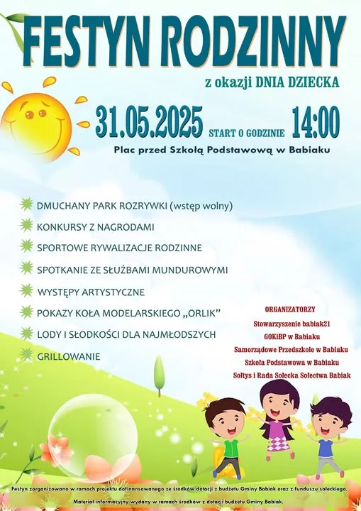 31 maja 2025 roku w Babiaku odbędzie się Festyn Rodzinny z okazji Dnia Dziecka. Wydarzenie rozpocznie się o godzinie 14:00. Miejsce wydarzenia to plac przed Szkołą Podstawową w Babiaku.