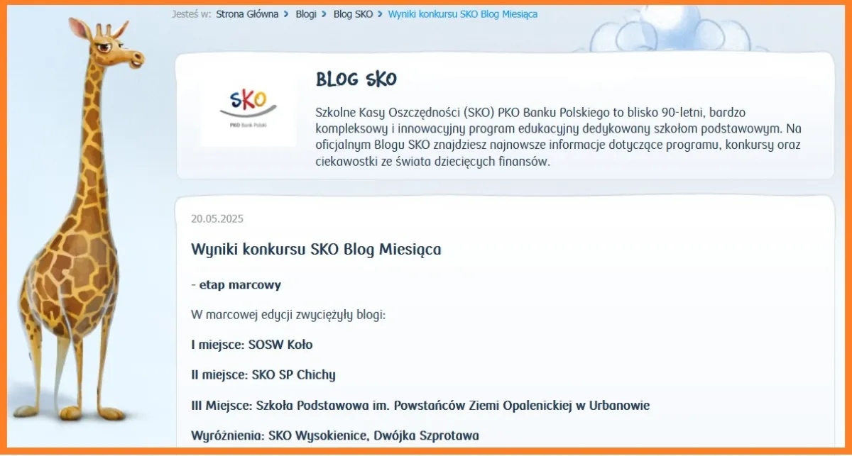 W marcu bieżącego roku Specjalny Ośrodek Szkolno-Wychowawczy im. Świętego Mikołaja w Kole osiągnął sukces, zdobywając pierwsze miejsce w ogólnopolskim konkursie „SKO Blog Miesiąca” organizowanym przez PKO Bank Polski. Jest to już drugi triumf kolskiego ośrodka w roku szkolnym 2024/2025, po wcześniejszym zdobyciu tytułu w edycji listopadowej.