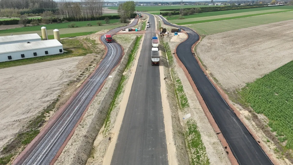 Budowa obwodnicy Koła nabiera tempa. Na głównym odcinku trasy ułożona została już warstwa wiążąca oraz podbudowa, a roboty drogowe prowadzone są również na jezdniach dodatkowych, gdzie trwa układanie kruszywa i asfaltu.