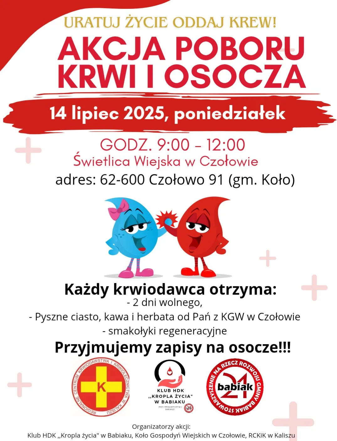 14 lipca 2025, poniedziałek, od godziny 9:00 do 12:00, Świetlica Wiejska w Czołowie. Wydarzenie to ma na celu zachęcenie mieszkańców do udziału w szczytnym celu, jakim jest oddawanie krwi oraz osocza.