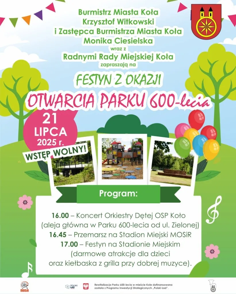 21 lipca 2025 roku w Kole odbędzie się otwarcie Parku 600-lecia. Uroczystość zorganizowana przez Burmistrza Miasta Koła Krzysztofa Witkowskiego oraz Zastępcę Burmistrza Monikę Ciesielską we współpracy z Radnymi Rady Miejskiej Koła ma na celu otwarcie parku po rewitalizacji.