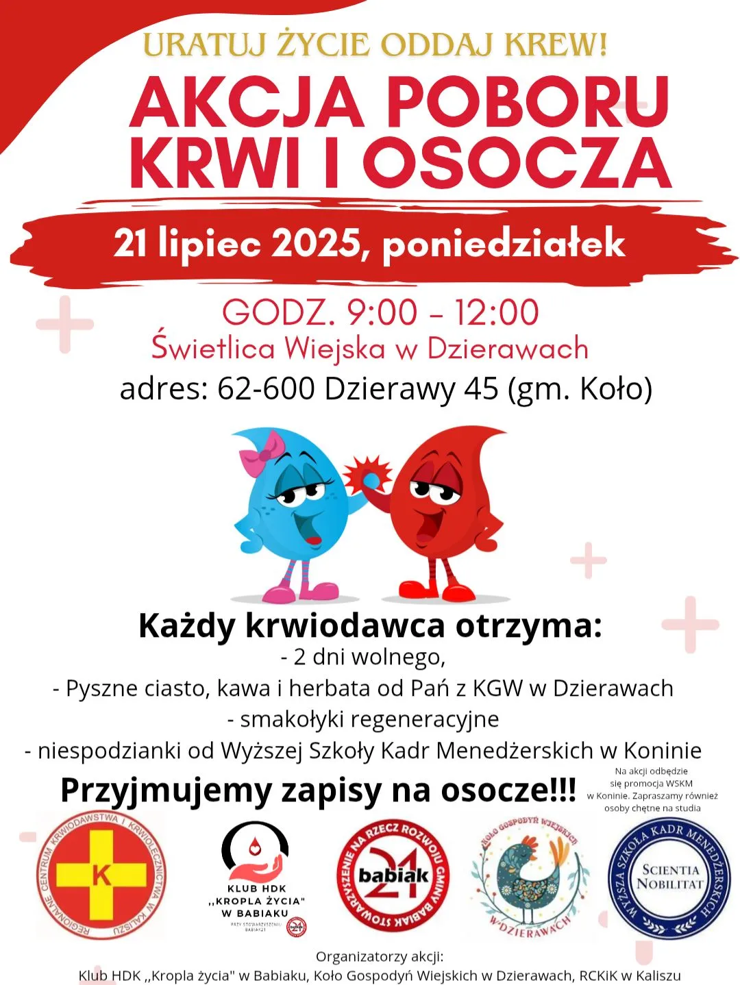 Akcja odbędzie się w poniedziałek, 21 lipca 2025 roku, w godzinach 9:00 - 12:00. Miejsce wydarzenia to Świetlica Wiejska w Dzierawach, znajdująca się pod adresem: 62-600 Dzierawy 45 (gmina Koło). Organizatorzy zachęcają wszystkich chętnych do udziału w akcji.