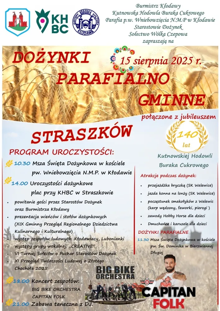 Główne uroczystości rozpoczną się o godzinie 10.30 Mszą Świętą Dożynkową w kościele pw. Wniebowzięcia Najświętszej Maryi Panny w Kłodawie. O godzinie 14.00 dalsze obchody przeniosą się na plac przy Kutnowskiej Hodowli Buraka Cukrowego w Straszkowie.