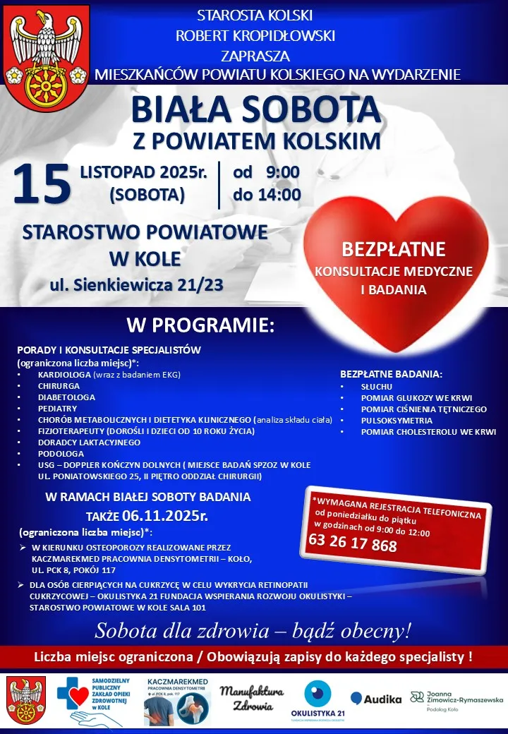 Starosta Kolski Robert Kropidłowski zaprasza mieszkańców powiatu kolskiego na wydarzenie prozdrowotne Biała Sobota z Powiatem Kolskim, które odbędzie się 15 listopada 2025 roku (sobota) w godzinach 9:00–14:00 w siedzibie Starostwa Powiatowego w Kole przy ul. Sienkiewicza 21/23.