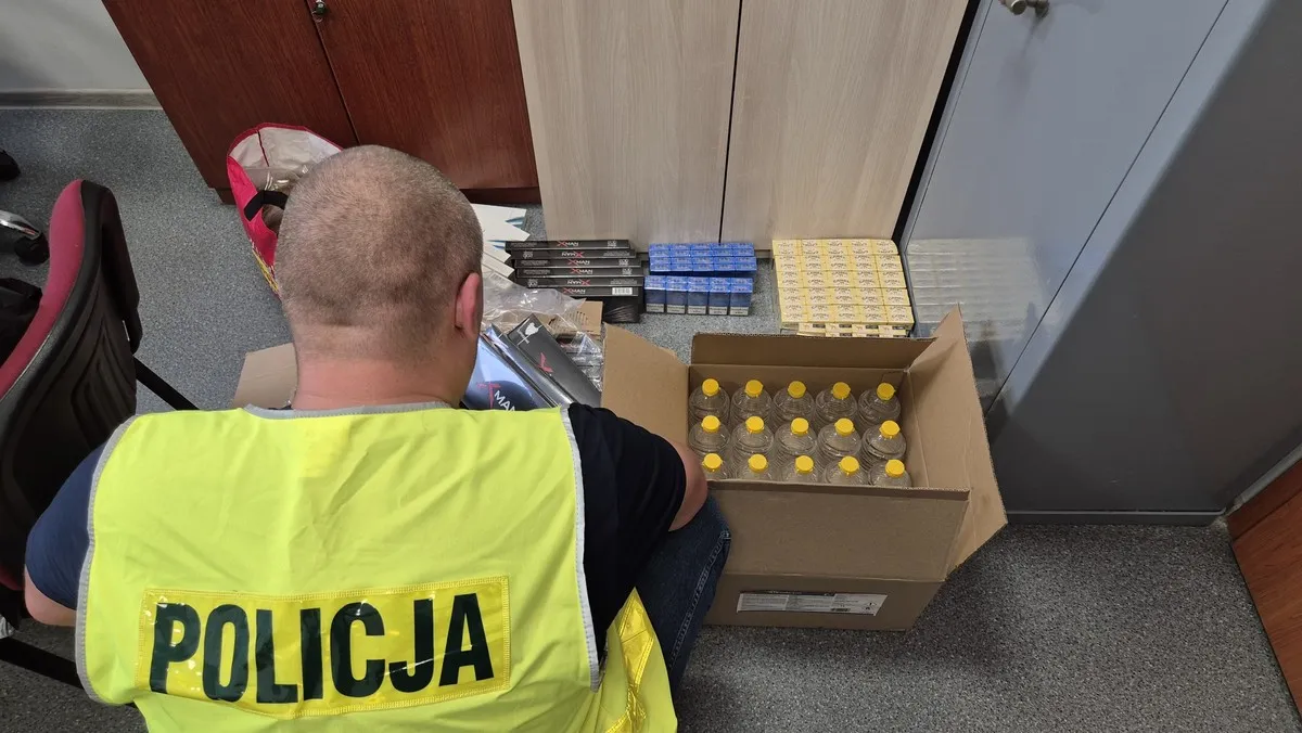 Po ujawnieniu podejrzanego ładunku policjanci przeprowadzili kolejne czynności, tym razem z udziałem funkcjonariuszy zajmujących się przestępczością gospodarczą. W wyniku działań zabezpieczono znaczną ilość papierosów oraz krajankę tytoniową pozbawioną polskich znaków akcyzy. Wśród zabezpieczonych przedmiotów znaleziono też butelki z przezroczystą cieczą, która zostanie poddana badaniom laboratoryjnym.