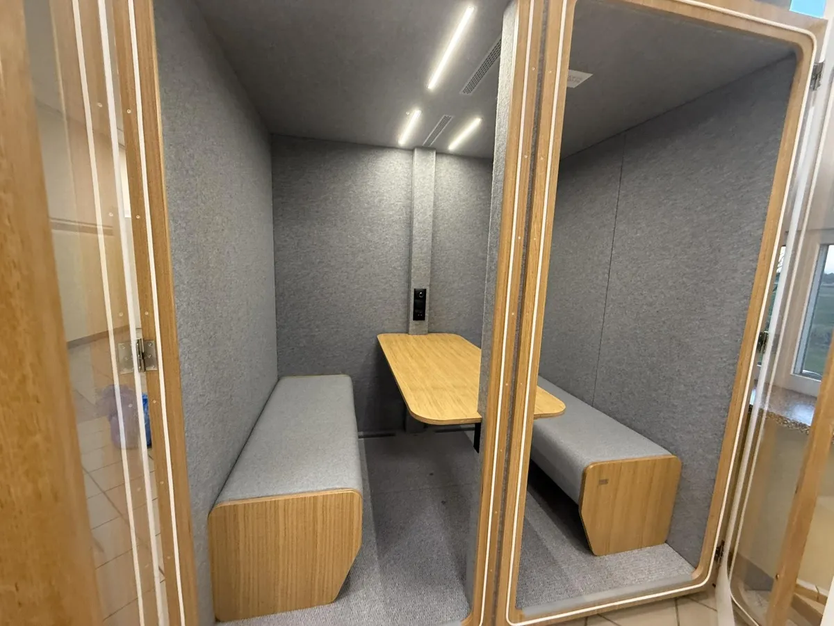 Kabina przewidziana jest jako miejsce do przygotowania nagrań. W praktyce oznacza to podcasty, prezentacje i materiały tworzone w ramach projektów szkolnych. Stabilne warunki dźwiękowe sprzyjają jakości nagrań, co jest istotne podczas pracy nad treściami multimedialnymi. Z budki można również korzystać podczas spotkań online i konsultacji. Daje to możliwość prowadzenia rozmów i wideopołączeń w odizolowanej przestrzeni, co poprawia czytelność przekazu i komfort pracy.