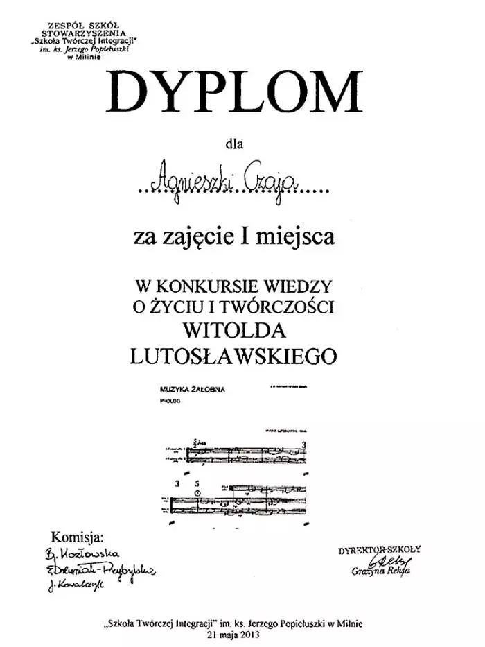 21 maja 2013 roku w Zespole Szkół Stowarzyszenia „Szkoła Twórczej Integracji” im. ks. Jerzego Popiełuszki w Milinie odbył się konkurs wiedzy o życiu i twórczości Witolda Lutosławskiego. Uczennica Gimnazjum nr 2 w Kole, Agnieszka Czaja, poradziła sobie najlepiej i zajęła I miejsce.