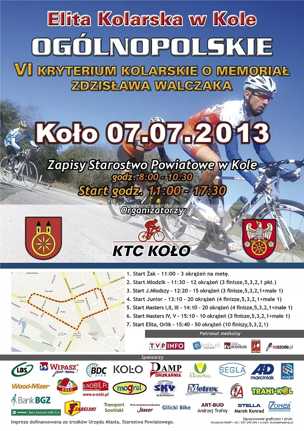Zapraszamy wszystkich mieszkańców do kibicowania oraz zainteresowanych uczestnictwem na Ogólnopolskie Kryterium Kolarskie o Memoriał Zdzisława Walczaka, które odbędzie się 7.07.2013 (niedziela) przy Starostwie Powiatowym w Kole.