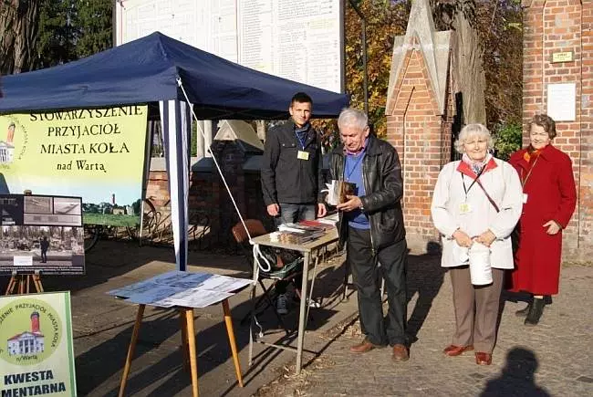 Apelowaliśmy do Państwa, by odwiedzając groby bliskich nie omijać obojętnie kwestujących, bowiem jak zwykle działali w szczytnym celu. Okazuje się, że widok członków organizacji z puszkami w dłoni nie wywołuje zdziwienia ani komentarzy, kolanie popierają działania naszych społeczników i wspierają realizowane cele. – Nie bijemy rekordu, choć przyznaję, że dotąd w każdym kolejnym roku udało się zebrać więcej, w zeszłym było to ok. 3.500 zł – powiedział prezes stowarzyszenia Grzegorz Mokrzycki. Przypomnijmy, że akcję zbierania dobrowolnych datków w przeddzień uroczystości Wszystkich Świętych na katolickim cmentarzu parafialnym w Kole na rzecz renowacji historycznych i zabytkowych płyt nagrobnych, nagrobków i grobów nie mających już opiekunów, została zapoczątkowana w 2003 r. w porozumieniu z włodarzem cmentarza, proboszczem parafii Podwyższenia Św. Krzyża, ks. kanonikiem Józefem Wronkiewiczem. Dzięki zebranym funduszom w latach 2003–2012 dokonano renowacji łącznie 16 obiektów. Od zeszłego roku cel tej szczytnej inicjatywy uległ zmianie. Tegoroczna kwesta, wzorem ubiegłorocznej, przeznaczona będzie na zagospodarowanie i budowę pomnika ofiar hitlerowskiego nalotu na dworzec kolejowy w Kole w dniu 2 września 1939 r. Odsłonięcie pomnika planowane jest na 75 rocznicę nalotu, tj. w dniu 2 września 2014r.