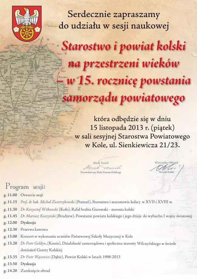 Na 15 listopada planowana jest sesja naukowa „Starostwo i powiat kolski na przestrzeni wieków – w 15. rocznicę powstania samorządu powiatowego”. Uroczystość odbędzie się w sali sesyjnej instytucji, początek o godz. 11.00.